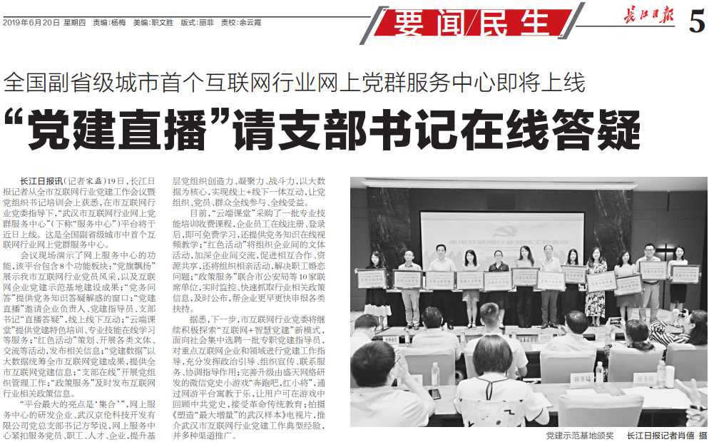 · 长江日报6月20日第五版 《全国副省级城市首个互联网行业网上党群服务中心即将上线“党建直播”请支部书记在线答疑》