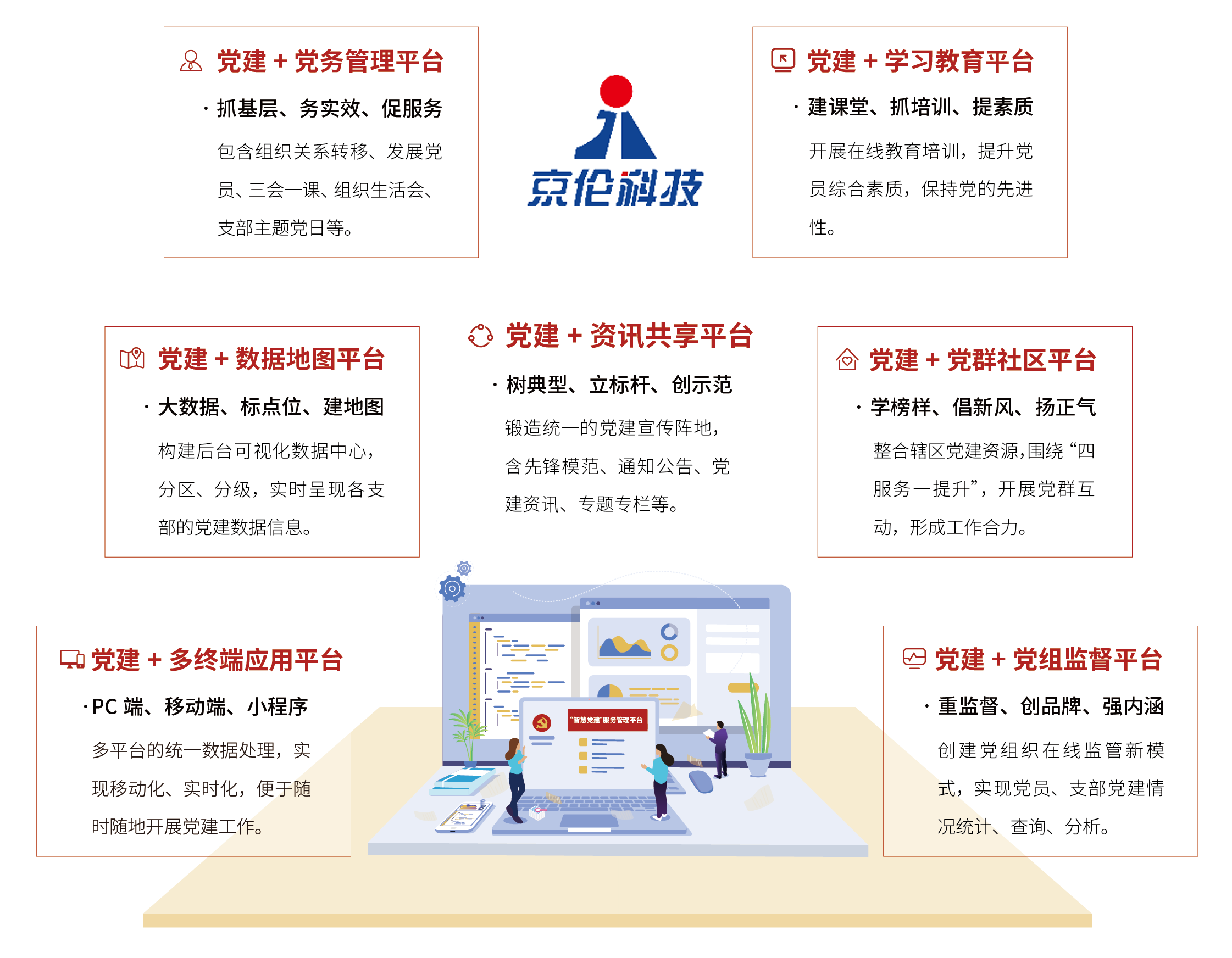 “武汉市互联网行业网上党群服务中心”平台是全国副省级城市中,首个发布的互联网行业网上党群服务中心。京伦科技凭借强大的企业资质、丰富的行业经验、过硬的专业技术、优秀的党建工作,以及去年年底自主研发的“智慧党建”服务管理平台成功案例,从众多互联网企业中脱颖而出,成为“武汉市互联网行业网上党群服务中心”平台的建设方。好构想+好技术,方能成就好平台。“武汉市互联网行业网上党群服务中心”平台的成功建设,离不开“智慧党建”服务管理平台构建的“1+6”体系支持。
