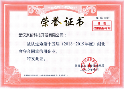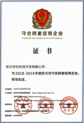 经各级市场监管部门审核推荐、市场监管局统一面向社会征求意见并经局长办公会研究同意,武汉京伦科技开发有限公司被湖北省市场监管局认定为湖北省第十五届(2018-2019)年度“守合同重信用”企业,被武汉市市场监管局、市文明办、市信用办认定为2018-2019年度武汉市“守合同重信用企业”。